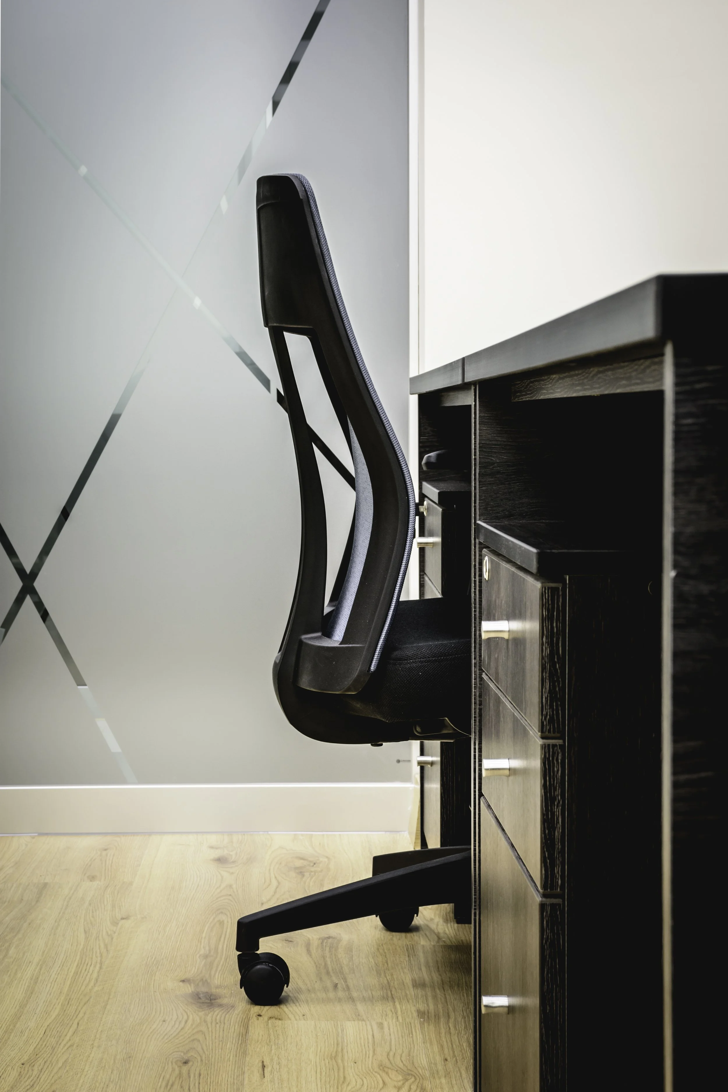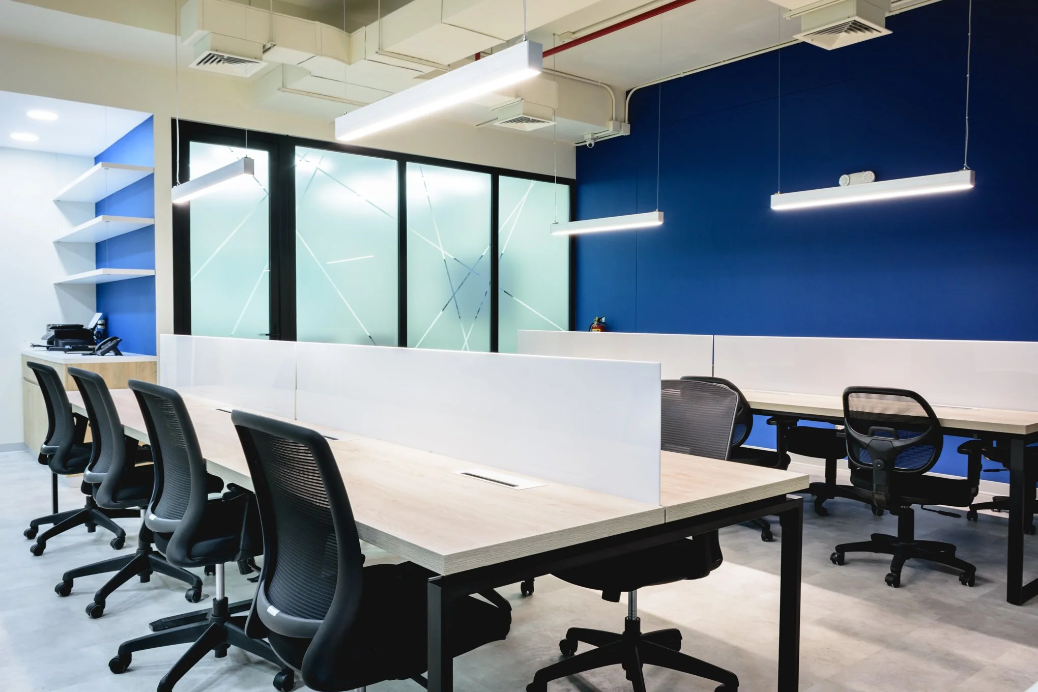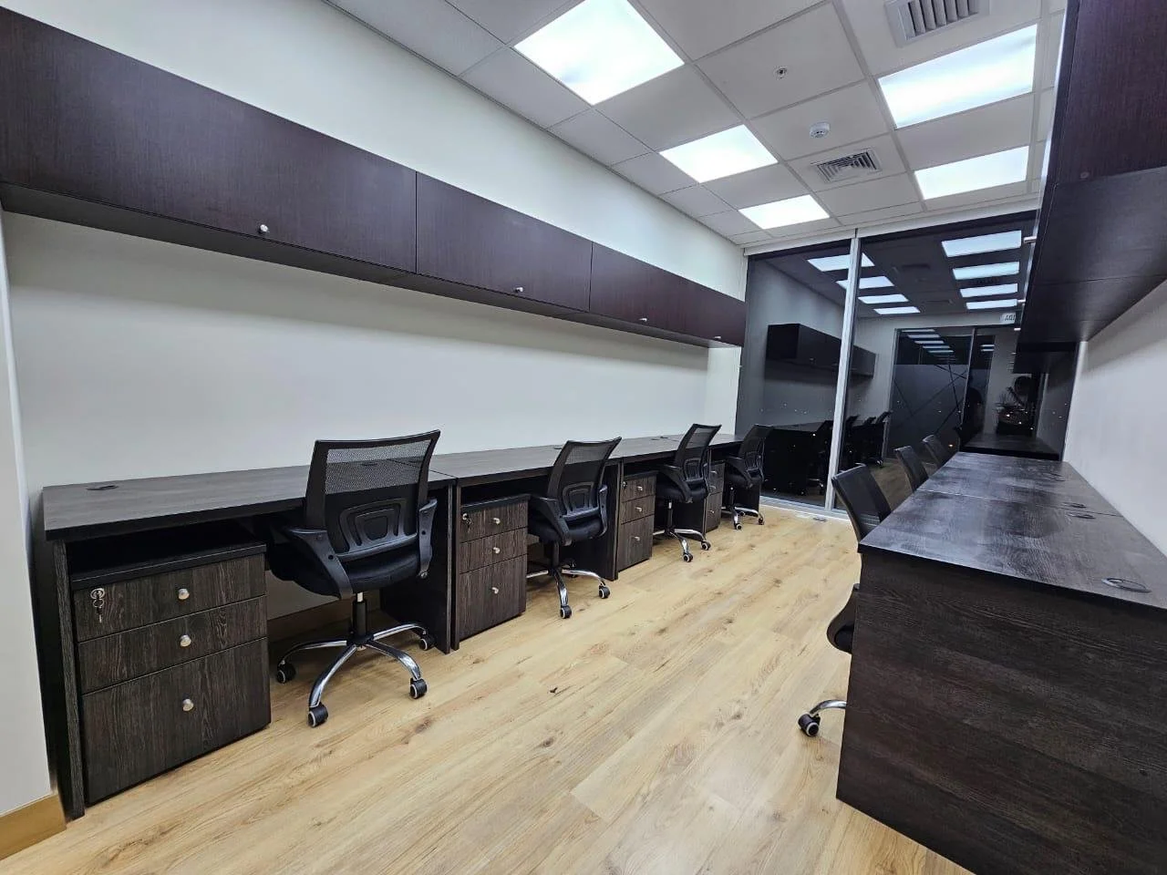 Cómodas oficinas privadas equipadas con escritorio de gran calidad, cajonera con cerradura y silla ergonómica, para cumplir con los estándares de seguridad.